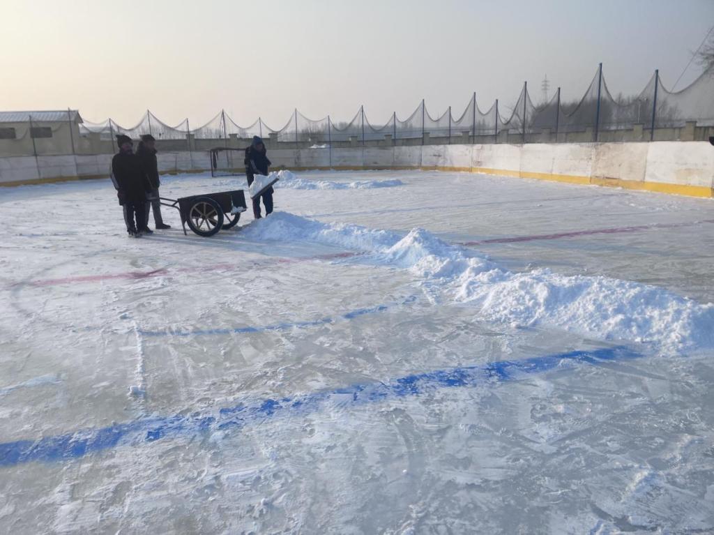 老师们和后勤人员纷纷主动请缨,毫不犹豫地化身成勤劳勇敢的“开拓者”。他们手持各种各样的工具,风风火火地开始了对场地的改造。清理杂物的时候,大家弯着腰,不辞辛劳,努力把冰场打造成纯净无暇的“画布”。