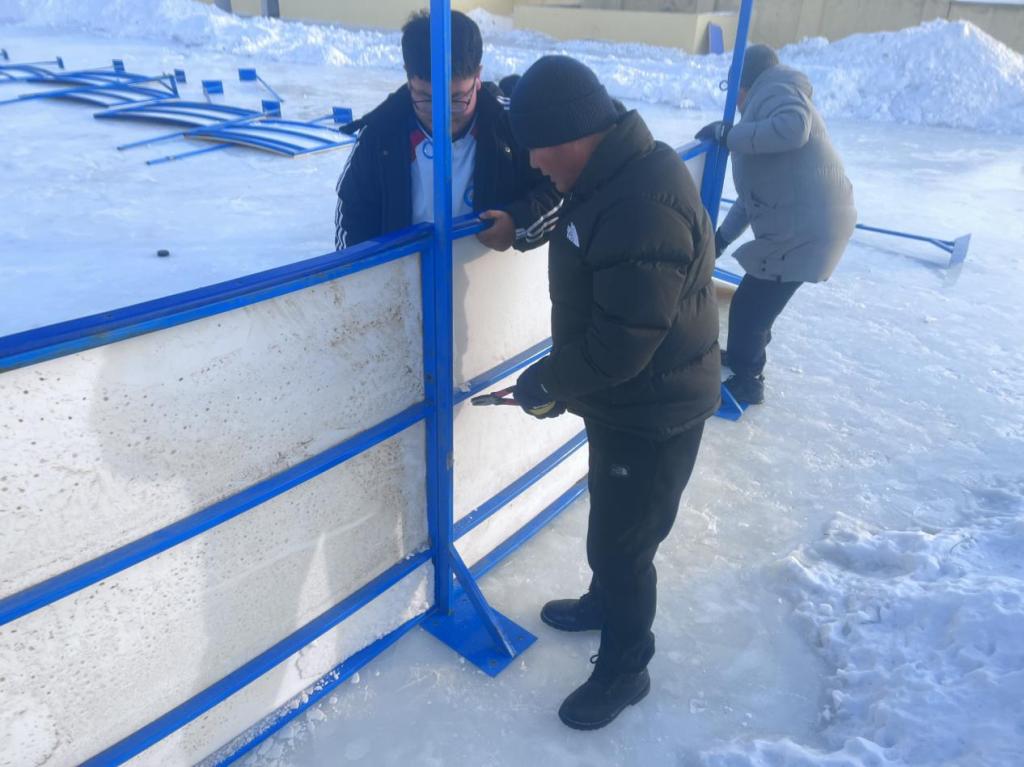 水龙头一打开,水便喷涌而出。这些水本应先在地上平整铺开,在低温环境下逐渐凝结成平整光滑的冰面,但在实际操作中,还未等到水均匀地在冰场上铺满,便已经迅速结冰,冰面瞬间变得坑坑洼洼。蜚克图中学的老师们充分发挥自己的聪明才智,找来木板、铁棍等材料,动手制作起了简易却十分实用的刮冰工具。在每次浇水过后,老师们就会小心翼翼地拿着这些工具,弯着腰,一点一点地在冰面上“精雕细琢”。他们一边刮着冰,一边拿着尺子反复测量,咬着牙在寒夜中一遍又一遍地重复着浇水、刮冰的辛苦工作。