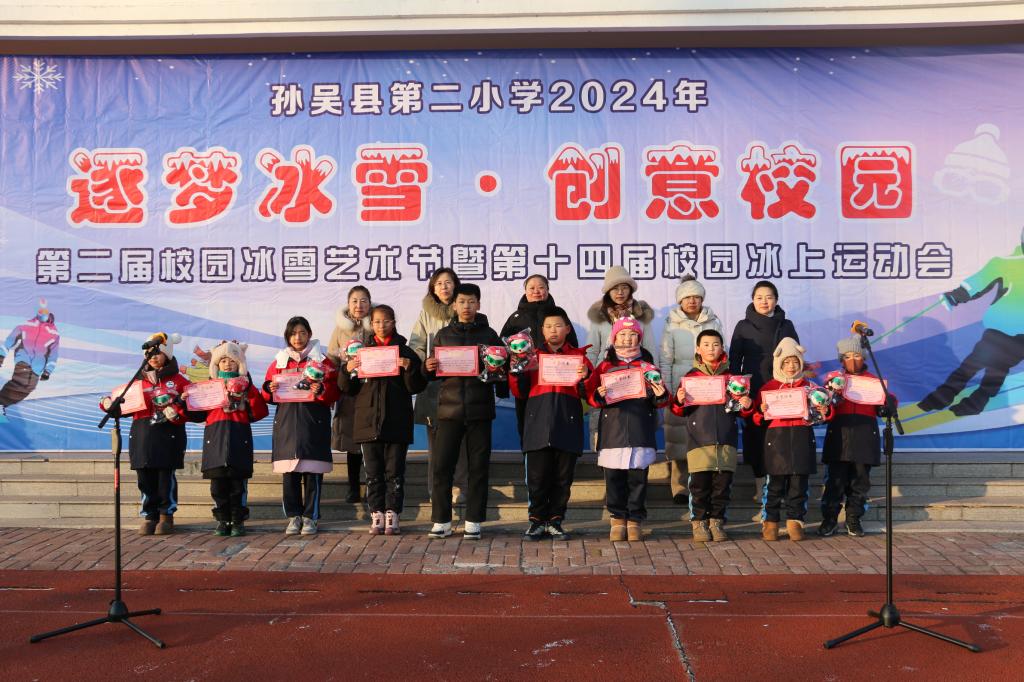 学生锻炼的是体魄,磨炼的是意志,激活的是生命,绽放的是笑脸。近年来在省、市举办的传统校比赛中,孙吴县第二小学成绩名列前茅,填补了孙吴县十几年冰上活动的空白。2005年至2009年连续五年参加全市传统校比赛,分别取得第四名、第三名、第二名、第一名的好成绩;在2008年全市传统校速滑比赛中共有14个单项,学校取得了11个单项冠军;2009年包揽所有组别的团体冠军;2011年取得了黑河市传统校速滑比赛团体总分第一名;2012年在黑河市“补丁”杯传统项目学校速滑赛团体总分第一名;2013年黑河市“补丁”杯传统项目学校速滑赛团体总分第一名。另外,在2008年全国短道速滑小学生联赛哈尔滨站比赛中,学校荣获了团体总分第五名的好成绩;2023年黑龙江省短道速滑男子接力比赛荣获全省第三名;2005年12月,学校代表黑河市接受省冰雪工作大检查,无论是软件建设还是硬件配备,以及活动的开展均受到各级领导的高度评价和认可;2006年12月,学校代表孙吴县接受黑河市体育局体育工作大检查,受到与会领导的高度评价。学校被授予市级冰上传统校、县级冰雪活动基地称号;2009年晋升为省级冰上传统校;学校连续多年荣获省级“百万青少年上冰雪”活动先进集体、市级“体育道德风尚奖”,主管校长、体育教师分别荣获省、市级“百万青少年上冰雪”活动先进个人、市级速滑指导教师等荣誉。
