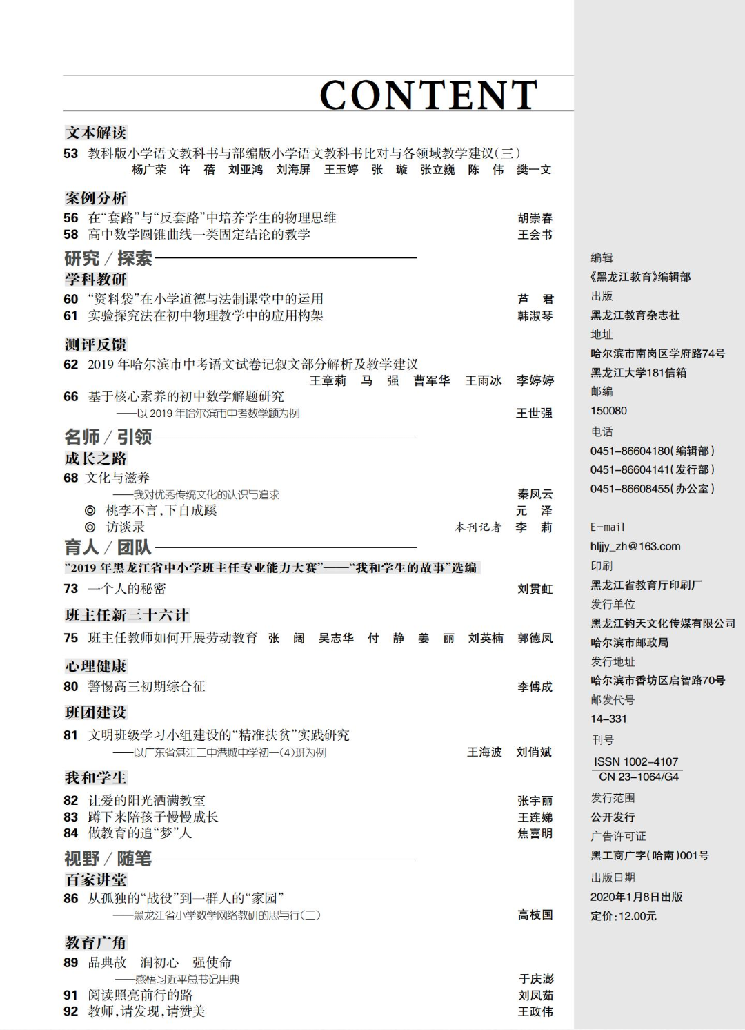 《黑龙江教育(教育与教学)》2020年第一期目录