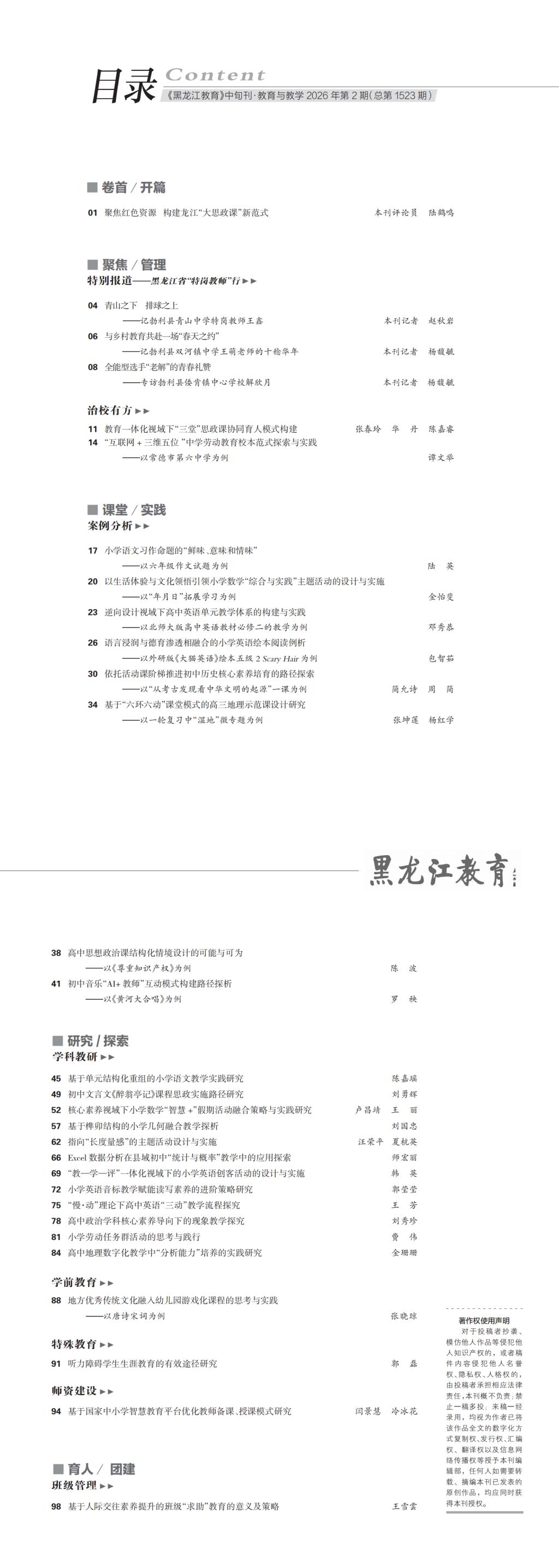 《黑龙江教育(教育与教学)》2026年第二期目录