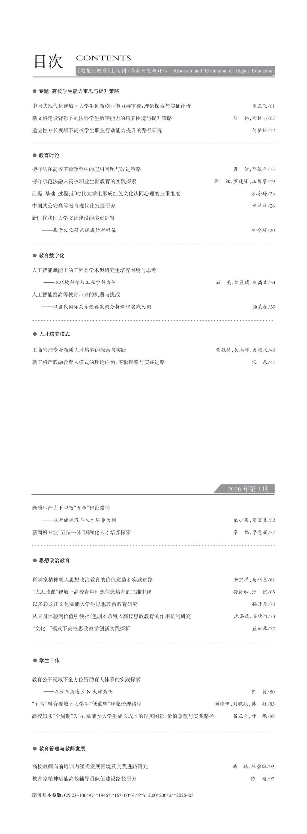 《黑龙江教育(高教研究与评估)》2026年第三期目录